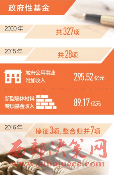 經(jīng)過幾輪清理規(guī)范后,到2015年,政府性基金已從2000年的327項(xiàng)減少到28項(xiàng)。2016年,國(guó)家進(jìn)一步清理收費(fèi)基金,停征價(jià)格調(diào)節(jié)基金等3項(xiàng)政府性基金,整合歸并散裝水泥專項(xiàng)資金等7項(xiàng)政府性基金。特別是針對(duì)小微企業(yè),加大了降費(fèi)力度。