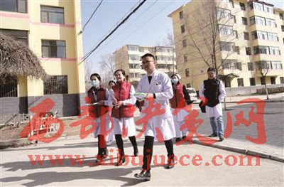 家庭醫(yī)生服務(wù)團隊人員走在上門訪視的路上。