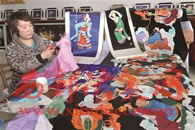 現(xiàn)任青海省民間工藝美術(shù)大師、國家非物質(zhì)文化遺產(chǎn)湟中堆繡的青海省代表性傳承人、湟中縣堆繡協(xié)會會長的喬應菊,自幼酷愛民間工藝,三十年前經(jīng)塔爾寺三絕藝術(shù)之一的堆繡老藝僧智華恩師的傳授,她執(zhí)著追求,苦學至今,形成了她特有的堆繡造型和配色特色。她對記者說:“堆繡是一種運用‘剪’、‘堆’技法塑造的獨特藝術(shù),用各色質(zhì)地不同的綢緞剪出人物、花鳥、山水等各種圖案,再根據(jù)設(shè)計需求逐一堆貼在黑色底子的大幅布幔上,形成了一個完整的畫面。堆繡分為‘平剪堆繡’和‘立體堆繡’,前者是將各色布料堆貼在事先設(shè)計好的圖案上,用彩線或金銀線鑲邊而成;后者則是用各色綢緞剪成佛像、人物、花卉等多種圖形,然后充塞羊毛或棉花,再用絲線繡織。堆繡整體圖案極富有立體感,人物形象逼真,畫面色調(diào)和諧,產(chǎn)生出豐富而生動的立體感和織物特有的肌理感,具有浮雕式的藝術(shù)效果,深受人們的喜愛”。