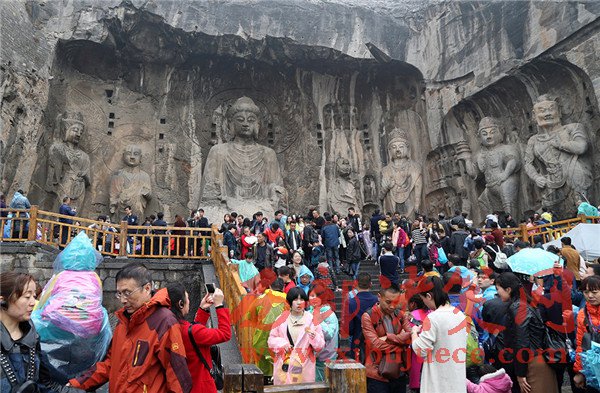 4月4日,游客冒雨游覽河南洛陽(yáng)龍門石窟。