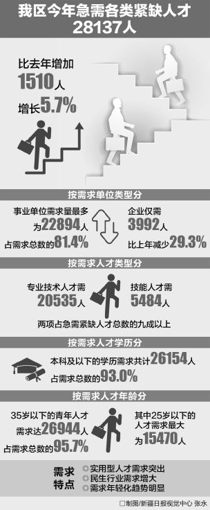 新疆急需緊缺人才需求年輕化趨勢明顯。2017年,35歲以下的青年人才需求達26944人,占需求總數的95.7%,其中25歲以下的人才需求最大,為15470人。“推進絲綢之路經濟帶核心區(qū)建設,急需具有創(chuàng)新活力的青年人才來疆謀事創(chuàng)業(yè)。”趙倩說。