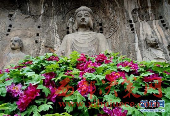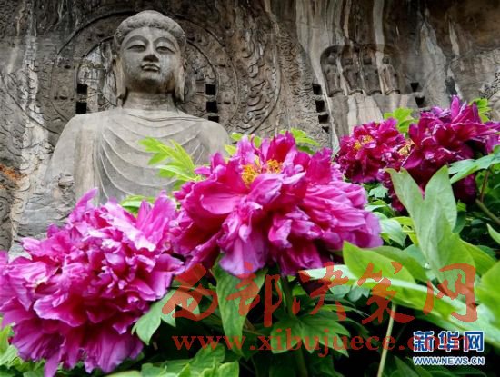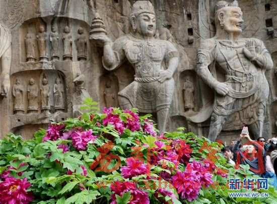 目前正值洛陽牡丹的盛花期,洛陽龍門石窟景區(qū)內(nèi)的近萬株牡丹爭奇斗艷,與古老的石刻佛像共同構成獨特的風景。