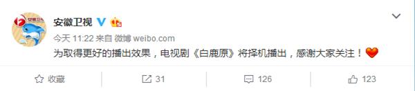 很多守在電視機(jī)前準(zhǔn)備看《白鹿原》的觀眾都撲空了,江蘇衛(wèi)視和安徽衛(wèi)視原計(jì)劃播放第2集的時間卻各自播放了其他內(nèi)容,但兩方都未對《白鹿原》停播作出解釋。就在今日,兩家衛(wèi)視都官方發(fā)表聲明表示,“為取得更好的播出效果,電視劇《白鹿原》將擇機(jī)播出,感謝大家關(guān)注!”