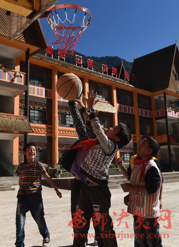 這是云南省貢山獨(dú)龍族怒族自治縣獨(dú)龍江鄉(xiāng)中心小學(xué)的獨(dú)龍族學(xué)生在新建成的教學(xué)樓前打籃球(2016年11月23日攝)。