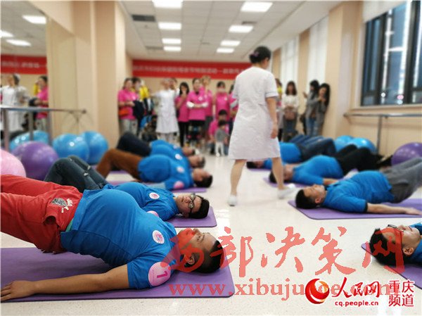 準(zhǔn)爸爸們體驗孕婦瑜伽,幾分鐘后,不少人累得氣喘吁吁。