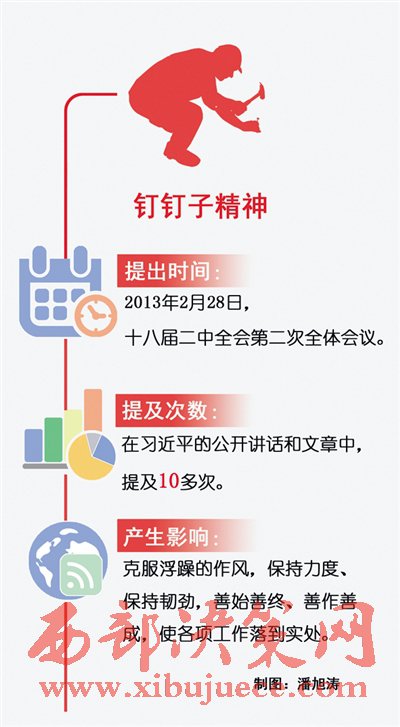 2013年2月28日,在十八屆二中全會第二次全體會議上,習(xí)近平首次對釘釘子精神進行了詳細闡述:我們要有釘釘子的精神,釘釘子往往不是一錘子就能釘好的,而是要一錘一錘接著敲,直到把釘子釘實釘牢,釘牢一顆再釘下一顆,不斷釘下去,必然大有成效。如果東一榔頭西一棒子,結(jié)果很可能是一顆釘子都釘不上、釘不牢。在之后的公開場合,習(xí)近平10余次提及釘釘子精神。