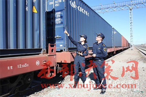 滿洲里海關(guān)關(guān)員正在對準(zhǔn)備從滿洲里口岸出境的中歐班列辦理快速驗放手續(xù)。