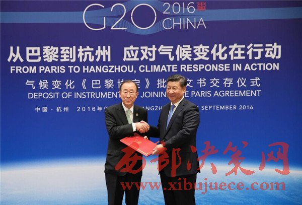 2016年9月3日,國家主席習近平同美國總統(tǒng)奧巴馬、聯(lián)合國秘書長潘基文在杭州共同出席氣候變化《巴黎協(xié)定》批準文書交存儀式。這是習近平向潘基文交存中國氣候變化《巴黎協(xié)定》批準文書。(記者 蘭紅光 攝)
