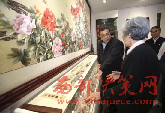 李克強2017年5月8日晚來到開封七盛角民俗文化街,在王素花汴繡館長時間駐足。82歲的王素花多年繼承創(chuàng)新宋代傳統(tǒng)刺繡工藝,是汴繡領(lǐng)軍人物??偫碜屑?xì)觀賞后稱贊她用色“多而不雜”,技藝“爐火純青”。