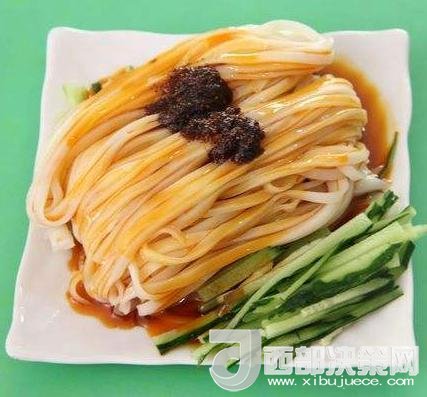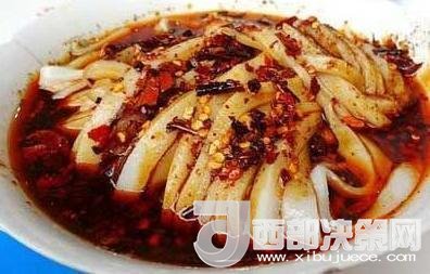 面皮與菜豆腐是漢中人最喜歡的早餐。將大米浸泡、磨漿,加水調制,蒸成薄片,待冷卻后切成細條。面皮色白,具有嫩、細、柔、韌、香等特點。輔以豆芽、菠菜、胡蘿卜絲、芝麻醬、辣椒油、大蒜汁或生姜汁,芥茉、五香粉、精鹽等調料,涼拌后紅綠相映、黃白互襯、色澤鮮亮,食之爽口,氣味芳香,風味獨特。