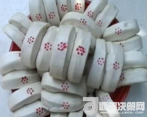 小吃本名“早告饃”,后來由于在饃上染花、放棗,所以又叫“棗糕饃”。棗糕饃用黃酒渣子做酵引,按季節(jié)用不同溫度的水和成面團,成型后再餳發(fā)半小時左右,用鐵鍋旺火蒸制而成。棗糕饃宜大量制作,用繩結串,吃時再蒸。棗糕饃不兌堿,色白質軟,略帶甜味,是待客、饋贈佳品。