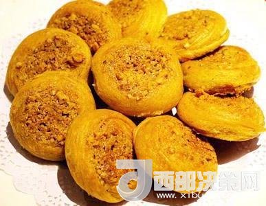 核桃饃為油面發(fā)酵而成。制作時需發(fā)酵三次,其間依次加入生面粉、食用植物油和用核桃仁經過浸泡去皮后與椒鹽、芝麻等調味品一起制成的核桃泥,和勻,揪劑,搟成長條,表面再抹上核桃泥,做成圓餅,最后再加上核桃泥和植物油,進爐烘烤。制成的核桃饃口感酥脆,味道香甜。