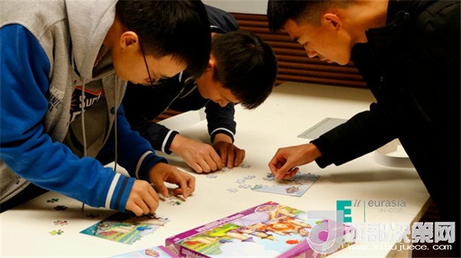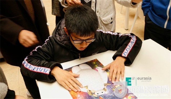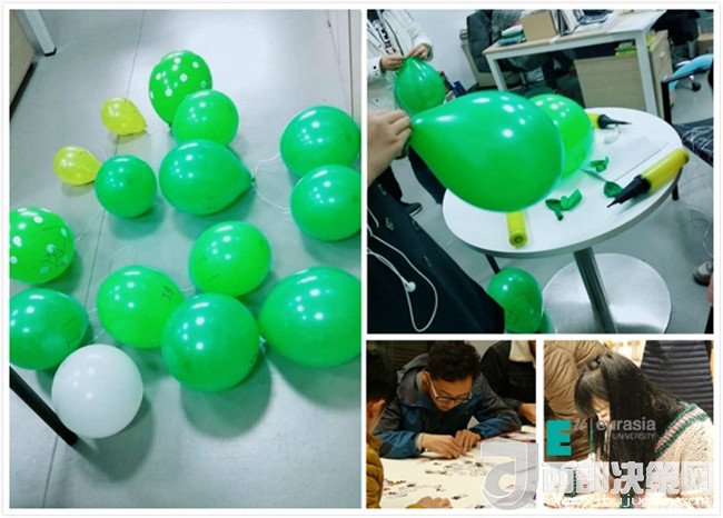 土豆和西紅柿根本就不是一個世界的,但它們走到了一起,變成了薯條和番茄醬它倆就是絕配;學(xué)籍制度和競技運動也不是一個世界的,但它們?nèi)诤显诹艘黄?,變成了頭腦風(fēng)暴和趣味運動它們也可以很般配,現(xiàn)在就讓我們來看看它們是怎么融合的……聽那陣陣氣球爆炸的聲音,他們開始了!在這些綠油油的氣球中有事先設(shè)置的題目隊員們要先擠爆氣球答完題才能得到下一個地方的線索,“補考成績不合格以及成績低于50分必須怎樣?”“本科選修課學(xué)分不得低于多少學(xué)分?”這些題是不是還要開動腦袋瓜仔仔細(xì)細(xì)的想想才有答案呢?在比賽的現(xiàn)場一秒都會和對手拉開差距,容不得一絲猶豫拿到線索的隊員們又奔向下一個地點熟悉的教室,這里也不是那么容易通過,看著黑板上的題“冰怎么很快的化成水?”“可替代大學(xué)英語四級成績的考試有哪些?”哦,還有計算題,隊員們必須腦洞大開,腦細(xì)胞飛速運轉(zhuǎn),做學(xué)霸那也是不容易的。只見黑板上粉筆一起一落,答題完畢,看看線索迅速趕往下一地點——地中海。這里指壓板、跳繩早已準(zhǔn)備好等著隊員們,學(xué)霸不能只管學(xué)習(xí)身體素質(zhì)也很重要,動起來吧!在指壓板上跳繩,誰想出來的?忍受著腳底的疼痛還要揮動跳繩?太受虐,但是我們是一群不屈不撓的新一代,指壓板上跳繩我們也是鏗鏘有力、一絲不茍。終于結(jié)束痛并快樂著的跳繩環(huán)節(jié),卻看到了整整400塊的拼圖,這個環(huán)節(jié)真是讓人又愛又恨,還記得兒時玩拼圖的快樂,但在這激烈的競爭環(huán)境下,卻是讓人有點心慌和畏懼。隊員們最終齊心協(xié)力戰(zhàn)勝了它,細(xì)心、耐心的逐一完好的拼完了每一副圖。