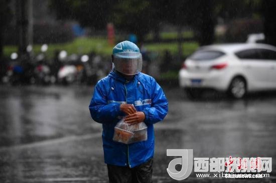 資料圖:外賣(mài)小哥冒雨送餐。中新社記者 劉冉陽(yáng) 攝