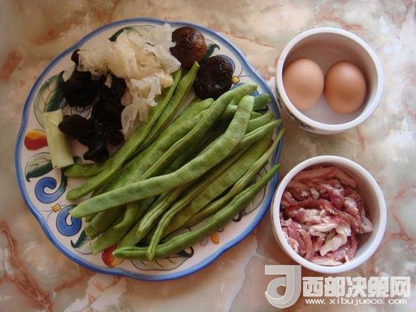 豆角:300克,大蔥:1段,木耳:4朵,香菇:4朵,銀耳:半朵,雞蛋:2個,五花肉:150克,醬油:5勺,老抽:1小勺,甜面醬:3勺,鹽:7克