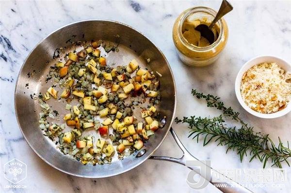 2、做餡:橄欖油鍋中加熱,加入切為碎屑的蘋果、洋蔥、迷迭香、百里香,小火煮大概10分鐘,直到它們軟化;