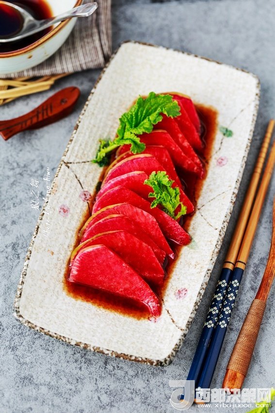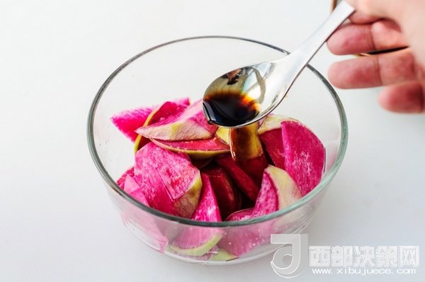 紅心蘿卜如果直接生吃過于單調(diào)了,用一點紅糖,少許陳醋調(diào)成汁把蘿卜浸泡了吃,口感層次豐富,營養(yǎng)和顏值也提升了一檔。紅糖溫中補血還可中和陳醋的酸澀,這樣調(diào)成的酸甜汁適合冬天做涼拌菜使用。