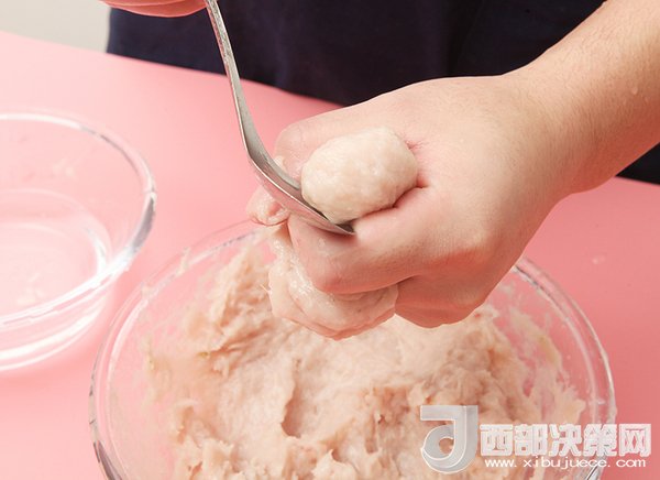 4、準(zhǔn)備一鍋冷水開始擠魚丸,拇指先在虎口處滑一下,把魚茸磨平,這樣擠出來的魚丸就會光滑。然后往上擠,用另一只手拿勺子接一下魚丸。