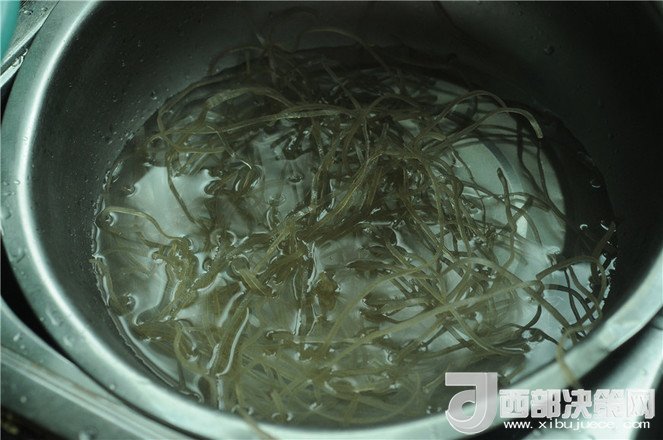 2.紅薯粉放入開水中泡發(fā)十分鐘左右,當(dāng)紅薯粉絲變軟后撈出來瀝干水