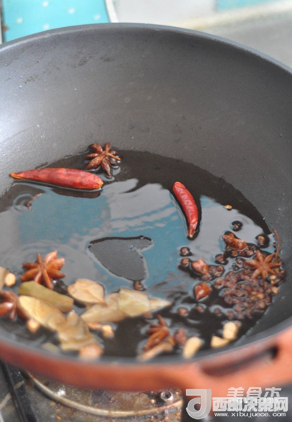 3.鍋里倒入油,放入花椒、大料、香葉、白芷、干辣椒,小火炸香