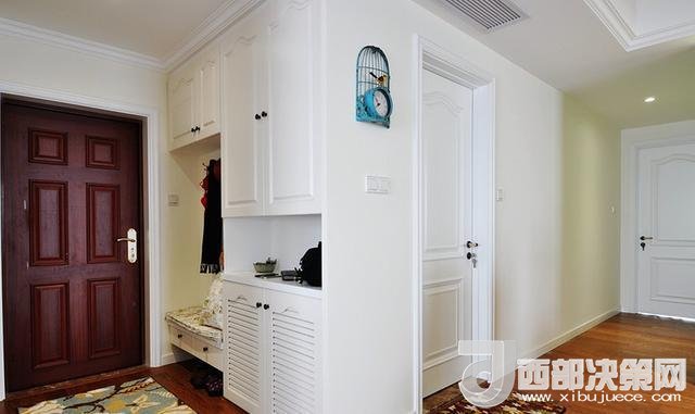 進(jìn)門玄關(guān),貼壁做了一排的櫥柜,模仿國(guó)外家居設(shè)計(jì),做了一個(gè)連體的矮柜換鞋凳,上方安裝掛鉤吊衣服。