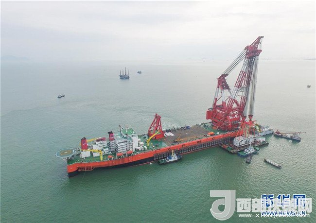 “振華30”起重船吊起重港珠澳大橋島隧工程海底隧道的最終接頭,準(zhǔn)備放置到預(yù)定位置(2017年5月2日攝)。 記者 劉大偉 攝