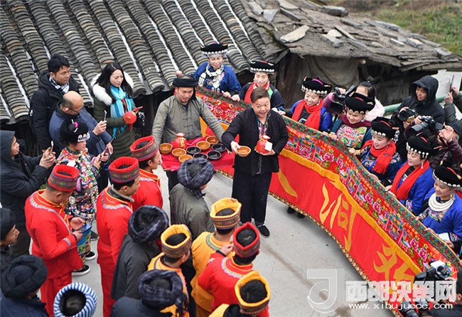 2018年2月4日,在湖南省湘西土家族苗族自治州花垣縣十八洞村,新郎的迎親隊(duì)伍遇上新娘親友攔門。當(dāng)日,兩對分別來自湘西和湘潭的新人特地來到十八洞村體驗(yàn)苗族婚禮。新華社發(fā)(薛宇舸 攝)