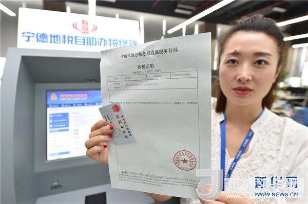 福建寧德時代新能源科技有限公司一名新入職的員工展示從自助辦稅終端打印的涉稅證明(2017年10月12日攝)。新華社記者宋為偉攝