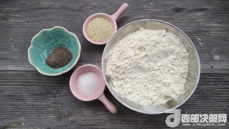 2.先做油酥:面粉20克+花椒粉3克+鹽5克+1勺芝麻混合