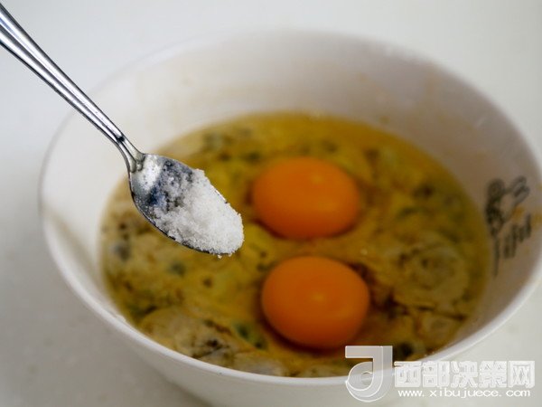 3.打兩個雞蛋在“2”中,并加鹽調(diào)味。