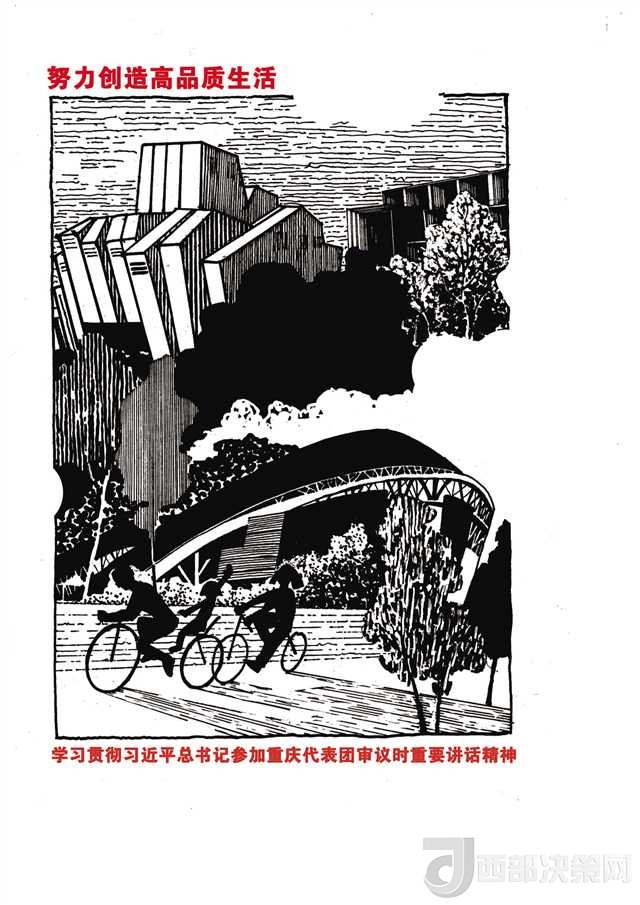 另一組負(fù)責(zé)“創(chuàng)造高品質(zhì)生活”的師生也遭遇類似的問題。最初師生們想用一組市民在公園鍛煉的場景來闡述這個(gè)主題,但很快就發(fā)現(xiàn)這樣的畫面太簡單蒼白。最終,他們將重慶大劇院、重慶美術(shù)館、奧體中心等重慶的標(biāo)志性建筑作為文化符號(hào)列入畫稿中,才有了令人耳目一新的感覺。