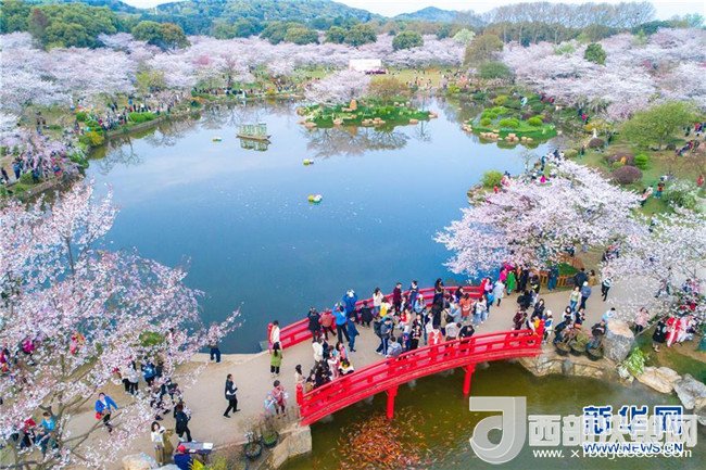 3月26日無(wú)人機(jī)拍攝的武漢東湖櫻花園。