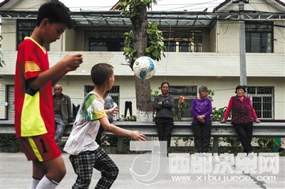 兩名小球員在街道上邊走邊玩球。有些鄉(xiāng)親還是認(rèn)為踢球是不務(wù)正業(yè),會(huì)影響讀書(shū)。