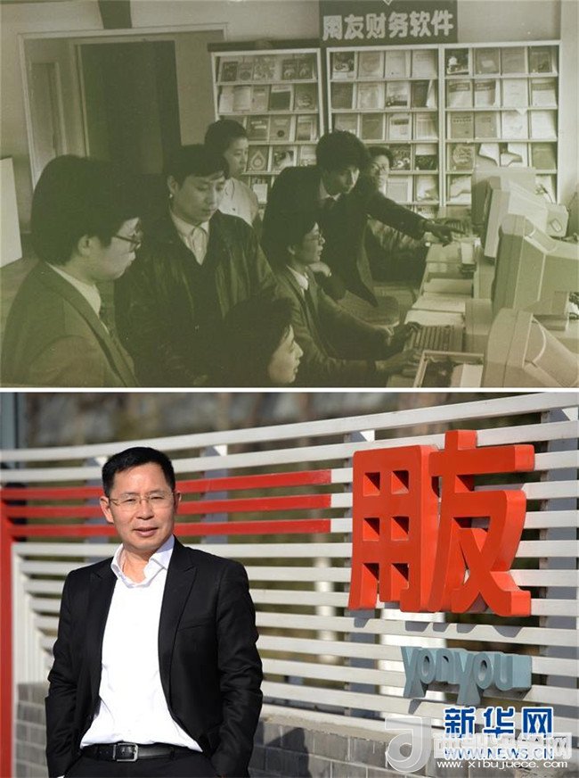 拼版照片:上圖為1989年的用友;下圖為用友網(wǎng)絡董事長兼CEO王文京(資料照片)。用友是中關村第一個拿到私營高新技術企業(yè)牌照的企業(yè),編號“SY0001”。從創(chuàng)業(yè)時2個人的軟件服務社,到30年后的1.5萬人,用友正從管理軟件公司向為企業(yè)“賦能”的知名云服務企業(yè)邁進。新華社發(fā)