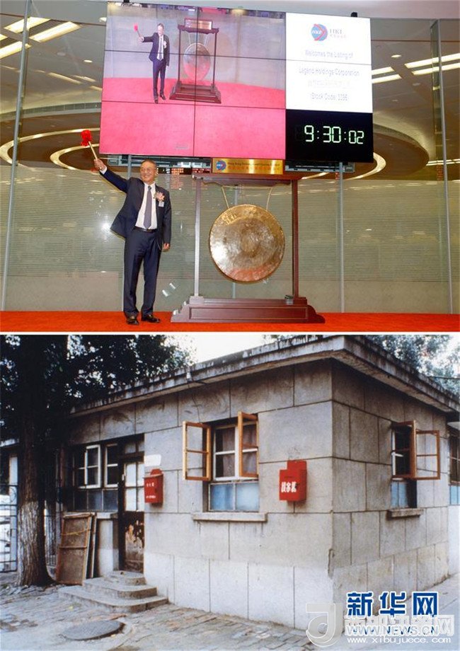拼版照片:上圖為2015年6月29日,聯(lián)想控股在香港整體上市,聯(lián)想控股董事長、聯(lián)想集團創(chuàng)始人柳傳志敲鐘;下圖為1984年,柳傳志等11位科研人員在一間不足20平方米的小平房(中科院計算所傳達室)中創(chuàng)辦了聯(lián)想。 新華社發(fā)