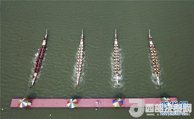 5月26日,參賽龍舟在浙江省溫州市會昌湖水面上比拼。當日,浙江溫州第五屆龍舟聯(lián)賽的一場比賽在會昌湖水上公園龍舟基地舉行。眾多龍舟同場競技,上演了精彩的水上比拼。新華社發(fā)(蘇巧將攝)