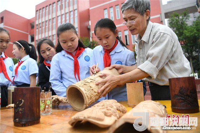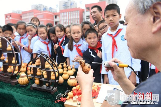 5月28日,為弘揚(yáng)中華民族優(yōu)秀傳統(tǒng)文化,迎接“文化與自然遺產(chǎn)日”的到來,重慶舉行“多彩非遺、美好生活”為主題的非遺進(jìn)校園系列活動(dòng)。圖為學(xué)生參觀葫蘆烙畫。 陳超 攝