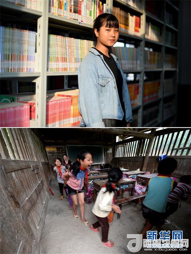 這是一張拼版圖片。上圖為2018年5月30日,在廣西三江侗族自治縣洋溪鄉(xiāng)中學(xué),14歲的吳瑩瑩在圖書館里留影;下圖為2014年6月10日,吳瑩瑩(前三)和同學(xué)們?cè)诘跄_樓教室里做游戲。
