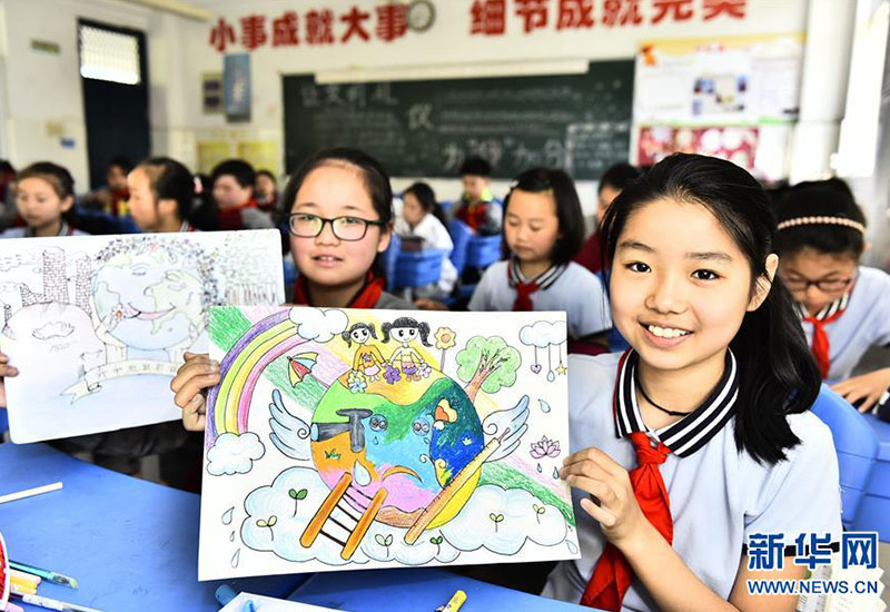 合肥市蜀山區(qū)井崗鎮(zhèn)新城小學(xué)學(xué)生展示自己在“善待地球,童繪藍(lán)天——我與地球的故事”繪畫活動中的作品(4月19日攝)。新華社發(fā)(葛宜年 攝)