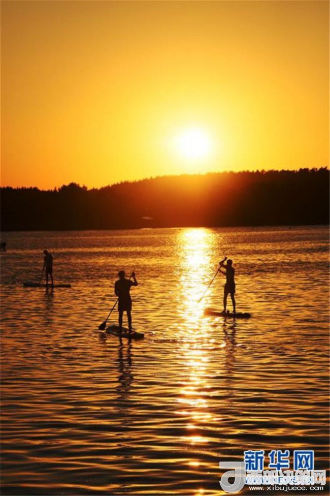 5月30日,特拉凱城堡所在的加爾韋湖上,年輕人在日落時(shí)分玩漿板沖浪。特拉凱城堡位于立陶宛首都維爾紐斯以西約25公里的加爾韋湖的一個(gè)湖心島上,始建于14世紀(jì)。新華社記者李驥志攝