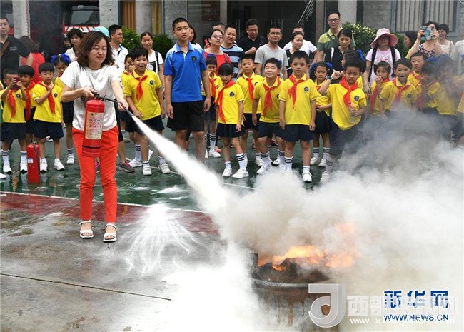 6月2日,一名家長(zhǎng)(前)在廣西南寧市青秀區(qū)公安消防大隊(duì)柳沙中隊(duì)體驗(yàn)用滅火器滅火。