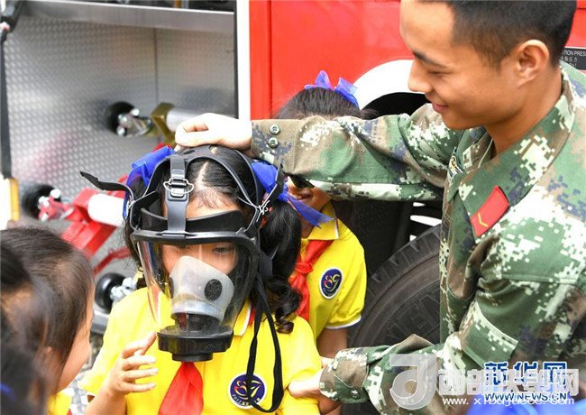 6月2日,一名消防官兵(右)在廣西南寧市青秀區(qū)公安消防大隊(duì)柳沙中隊(duì)為孩子佩戴消防面罩。