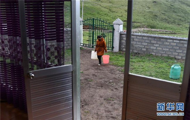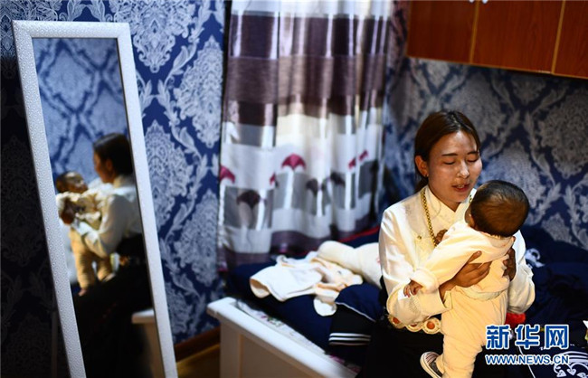 6月13日,在河南蒙古族自治縣易地扶貧搬遷安置小區(qū)幸福家園,2018年初搬進(jìn)新家的關(guān)卻措在照看自己的外甥才華南杰。新華社記者 張宏祥 攝