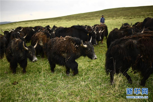 6月13日,在河南蒙古族自治縣賽爾龍鄉(xiāng)蘭龍村雪多牦牛繁育基地,牦牛在草場上覓食。新華社記者 張宏祥 攝