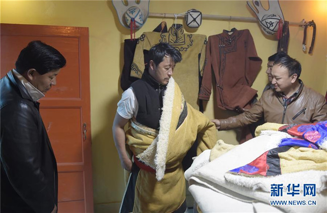 6月13日,在河南蒙古族自治縣那日宗畜牧業(yè)牧民專業(yè)合作社民族服裝加工廠,工廠負(fù)責(zé)人才讓東知(左二)在為客人展示蒙古族服裝。新華社記者 魯鵬 攝