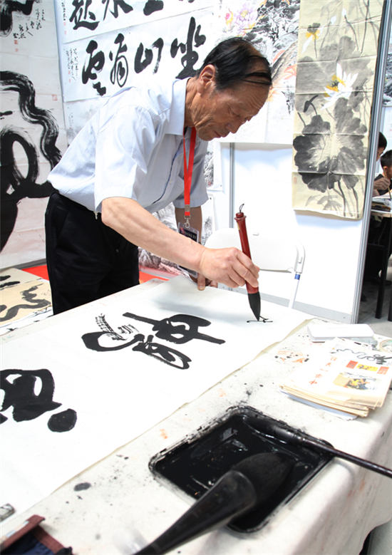石博會邀請到來自北京、天津、河南、江蘇、甘肅、沈陽及新疆等地的并在全國享負(fù)盛名的近80位書畫大師現(xiàn)場揮墨。其中有人物畫、花鳥畫(走獸)、山水畫、篆,隸,行,楷,草書法等作品一一呈現(xiàn)。為社會各界鐘情于傳統(tǒng)書畫藝術(shù)的人士提供與大師近距離接觸的機(jī)會,讓到場的各位書畫愛好者大飽眼福,眾多大師的作品給人留下深刻的印象