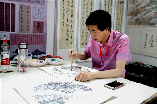 甘肅畫家盧旭東正在展會中心書畫展區(qū)創(chuàng)作國畫