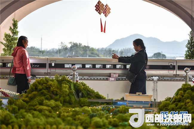 在泰國(guó)東北部呵叻府巴沖縣,參觀者在中泰鐵路合作項(xiàng)目一期工程開(kāi)工儀式上與展出的中國(guó)復(fù)興號(hào)高鐵列車模型合影(2017年12月21日攝)。新華社記者 李芒茫 攝