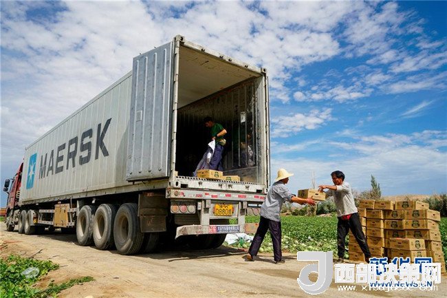 6月27日,新疆哈密市伊州區(qū)南湖鄉(xiāng)瓜農把剛采摘的哈密瓜裝入冷藏廂式貨車外運。