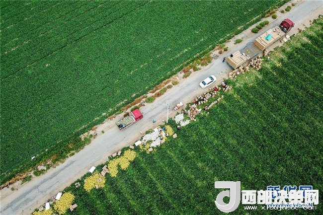 6月27日,新疆哈密市伊州區(qū)南湖鄉(xiāng)瓜農將采摘的哈密瓜堆放在地頭,準備裝車外運(無人機拍攝)。